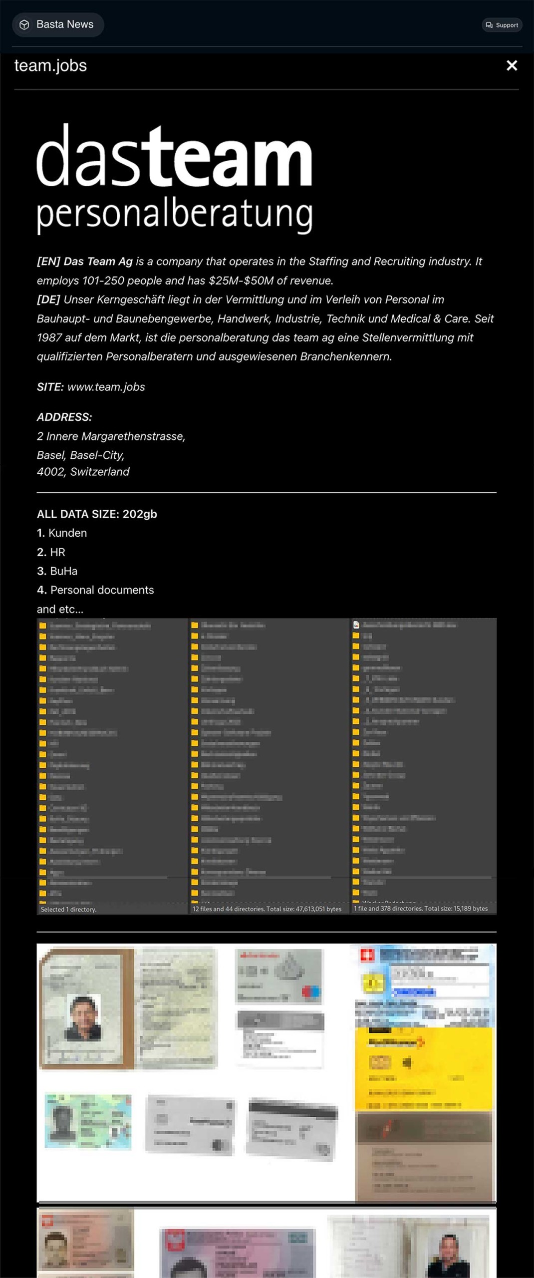«En décembre 2023, Das Team AG a été victime d’une cyberattaque», confirme l’entreprise à inside-it.ch. Le gang du ransomware Black Basta a attaqué le recruteur et a affirmé avoir volé plus de 200 Go de données et les avoir publiées sur le dark web.